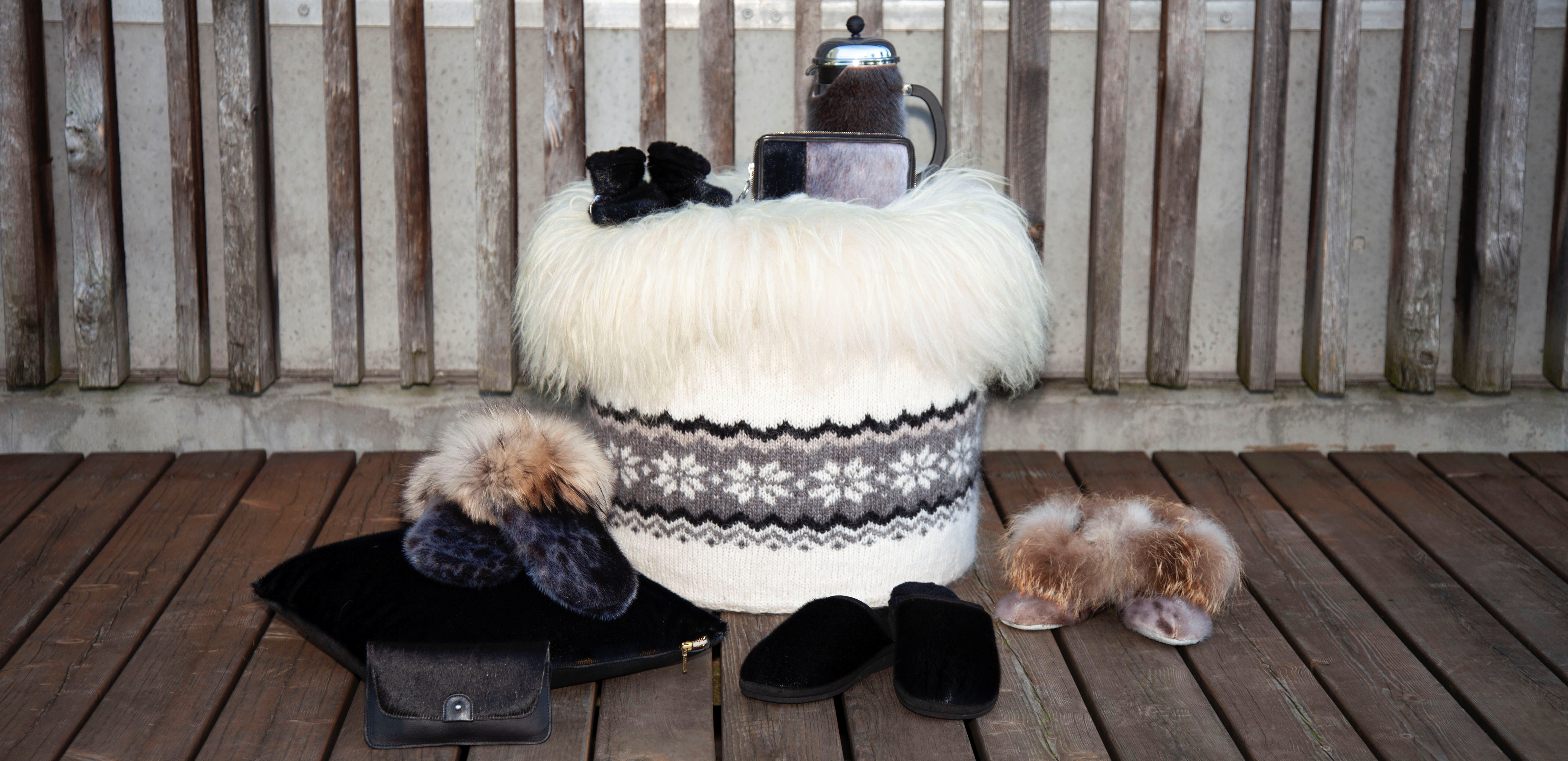 Vi har blandt andet luffer, hjemmesko, smykker og interiør lavet i sælskind.