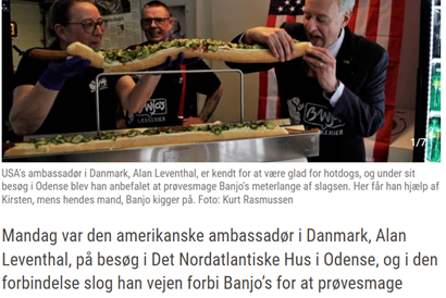 28 mar. 2023. Fyens Stiftstidende. "Mandag var den amerikanske ambassadør i Danmark, Alan Leventhal, på besøg i Det Nordatlantiske Hus i Odense, og i den forbindelse slog han vejen forbi Banjo’s for at prøvesmage grillens berygtede meterhotdog."