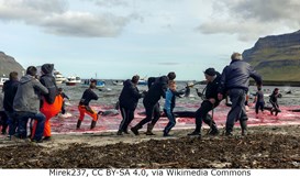 Grindehvalen er en lille hval, der svømmer i flok. Det er en tandhval. Det betyder, at den har tænder og ikke barder. Grindehvalen spiser mest blæksprutter. Den findes i havet både i det sydlige Grønland og omkring Færøerne, men det er mest på Færøerne, den bliver fanget og spist. Når en flok er tæt på land, driver man flokken ind mod stranden med både. Folk løber ned til stranden og hjælper til med fangsten. Når hvalerne er inde på lavt vand, bliver de slagtet med nogle særlige knive. Det går meget hurtigt. Men det ser meget blodigt ud. Havet omkring hvalerne bliver helt rødt. Man skal have et særligt ”kørekort” for at have lov at slagte hvalerne. Kødet deles – også blandt dem, der ikke har været med til fangsten.