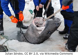 Grønlandshvalen er en bardehval. Det betyder, at den har nogle lange plader i munden med små hår langs kanterne. Når grønlandshvalen tager en mundfuld vand i munden, sier barderne små dyr fra vandet, fordi de hænger fast i bardernes hår. Så kan hvalen sluge de små dyr. Grønlandshvalen kan blive 18 meter lang og veje 100 ton. Det er ca. det samme som 100 biler. Og så kan den blive 200 år gammel. Man må fange 2 Grønlandshvaler om året i Grønland. Her spiser man en del hvalkød, men mest fra vågehvalen. Jagt på store hvaler var faktisk det, der var vigtigst for grønlændernes forfædre, og noget de var rigtig gode til.