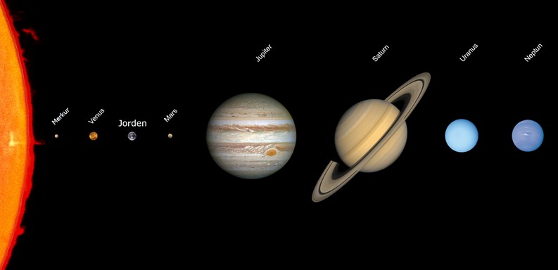 Planeten Venus ligger ca. 40 millioner kilometer tættere på solen en Jorden. Planeten Mars ligger ca. 80 millioner kilometer længere væk fra solen end Jorden.