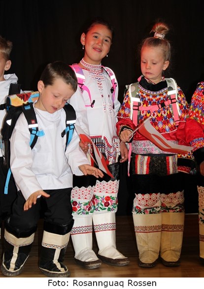I Grønland bruger man tit nationaldragten. Mange børn har den på første gang til deres første skoledag. I Grønland begynder man i 1. klasse og ikke 0. klasse som i Danmark. Til gengæld går man først ud af skolen i efter 10. klasse.