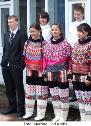 Nu skal vi se nærmere på national-dragterne fra Grønland og Færøerne. Det er noget tøj, som man har på ved helt særlige fester. Vi skal også høre lidt om dans til nogle af disse fester. Men vi skal også se på, hvad for noget tøj grønlændere og færinger har på i dag.