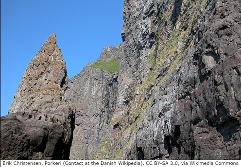 Færøerne er opstået for ca. 60 millioner år siden og har fået deres form gennem flere forskellige vulkanudbrud og istider. Når lavaen væltede op i havet, størknede den og blev til basalt; en hård sort stenart. Selve asken fra udbruddene blev til tuf, en rødlig og porøs sten. Når man sejler langs den færøske vestkyst, ser man flere steder på de stejle klippesider tydeligt de skiftende lag af basalt og tuf.