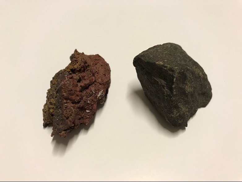 - Hvilken af stenen på billedet er basalt, og hvilken er tuf?