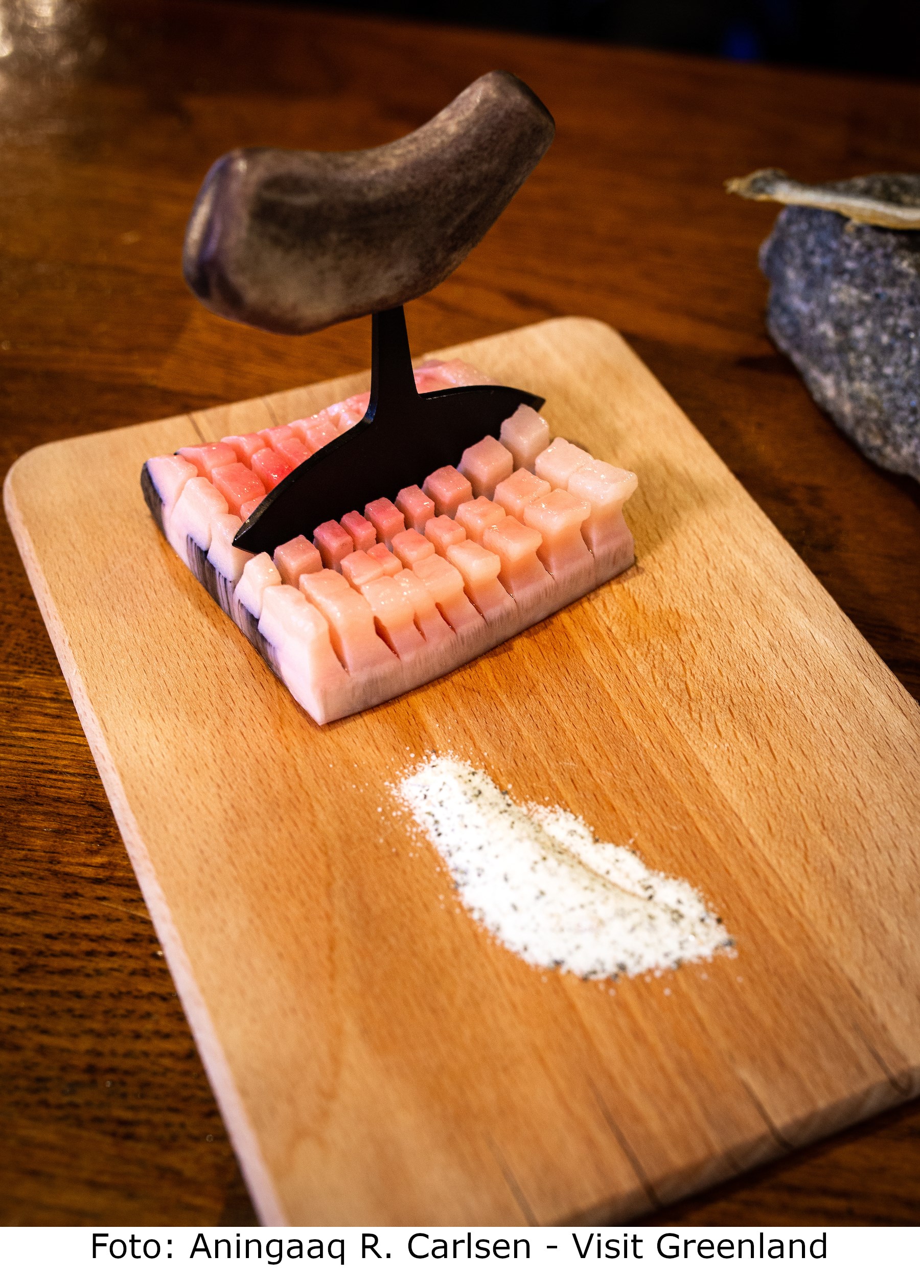 I Grønland har man en genre af mad, kaldet kalaalimernit - grønlandsk proviant, som er lavet af grønlandske råvarer. Den helt store specialitet her er mattak, som består af rå hvalhud med spæk. Man spiser det i små stykker ved at drysse Aromat på eller dyppe det i soya, inden man tager det i munden. Så skal man tygge det godt igennem, inden man sluger det. Det lyder måske ikke så lækkert, og det er lidt som at tygge i gummi, men det smager ret godt.