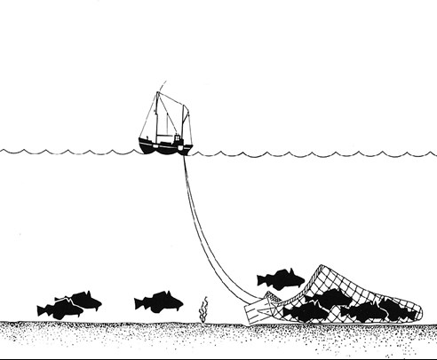 Når man trawler på bunden af havet, skraber trawldøre og net hen over bunden. På den måde får man lavet meget skade på havbunden og skader altså også de fisk og dyr, man egentlig ikke vil fange. Tidligere fangede man også større fisk i nettet, når man egentlig var ude efter rejer, men i dag er der lovgivning om at bruge sorteringsgitre over indgangen til nettet, så store fisk sorteres fra. På den måde begrænser man noget af skaden ved trawling.