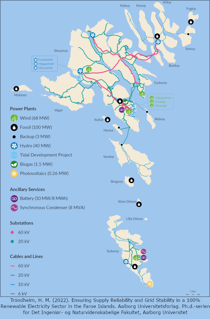 På Færøerne er der et elnet, som strækker sig ud over de mest befolkede områder. Men de små øer og Suðeroy er ikke forbundet med dette elnet.